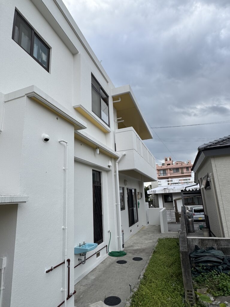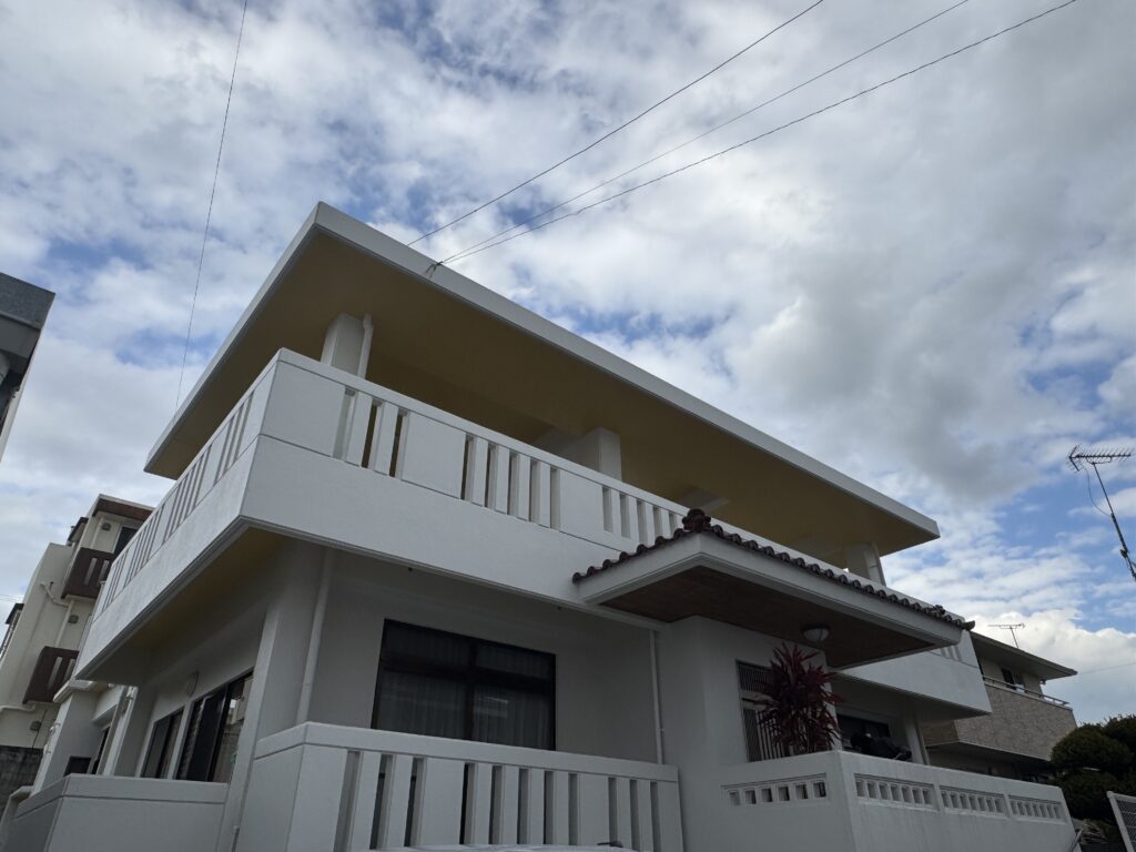 また、屋上や防水層が必要な部分については、防水工事もあわせて実施しました。名護市のように紫外線や雨風の影響を受けやすい地域では、外壁だけでなく屋上や水平面の防水状態も非常に大切です。防水工事を行うことで、雨漏りのリスク軽減や建物の保護につながり、住まいをより良い状態で維持しやすくなります。