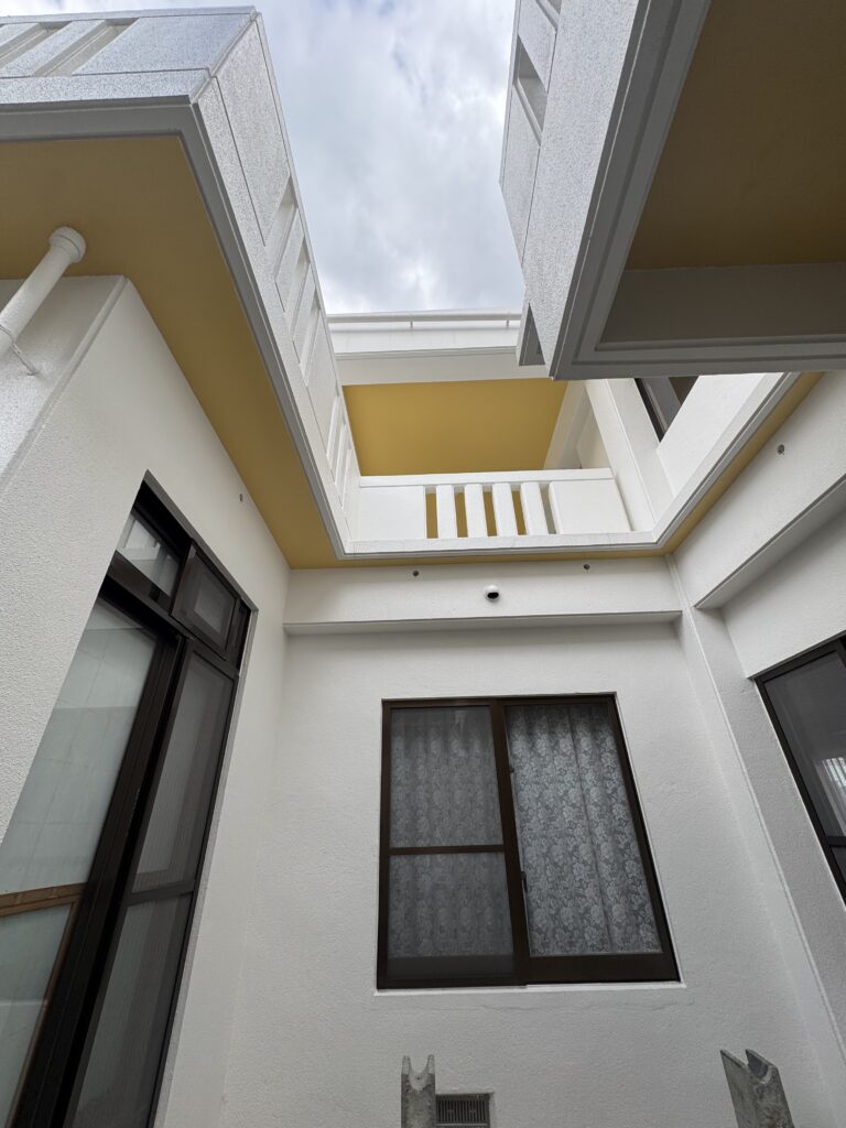 今回の点検では、外壁塗装を行った部分だけでなく、クラック補修を行った箇所や防水工事を実施した屋上まわりについても確認しています。名護市のように紫外線や雨風の影響を受けやすい地域では、施工後の状態確認も大切です。外壁や防水層の状態を定期的に点検することで、住まいをより良い状態で維持しやすくなります。