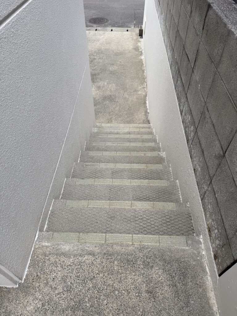 また、今回の工事では外壁や屋上だけでなく、施工前に土間の洗浄も実施していました。土間は日々の汚れが溜まりやすい部分ですが、事前にしっかり洗浄を行うことで、建物まわり全体がよりすっきりとした印象になります。外壁塗装や防水工事とあわせて土間まで整えることで、住まい全体の清潔感や美観がより引き立つ仕上がりとなりました。